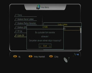 geliniz. 2. “ OK “ ile onaylayınız ve açılan pencereye, 4 rakamlı şifrenizi giriniz. ( Şifre hiç değiştirilmemiş ise, fabrika çıkış değeri olan “ 0000 “ değerini giriniz ). 3. ▲▼ tuşları yardımıyla, “ Fabrika Ayarı “ seçeneğine geliniz ve “ OK “ Tuşuna basınız. 4. Açılan pencerede, gene ▲▼ tuşları yardımıyla “ Uydu Sil “ seçeneğinin üzerine geliniz ve “ OK “ ile onaylayınız. |